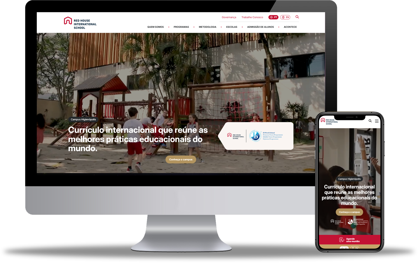 A Red House International School é uma instituição referência em ensino bilíngue, com unidades em diferentes regiões do Brasil. Em um momento de expansão e consolidação da marca, a escola buscava evoluir sua presença digital, criando um canal capaz de conectar pais, alunos e parceiros de forma integrada. Mais do que um novo site, a instituição desejava construir uma plataforma digital estratégica, que apoiasse o relacionamento com as famílias e desse autonomia para que cada unidade gerenciasse seu próprio conteúdo, mantendo a consistência da marca e a qualidade da experiência.
